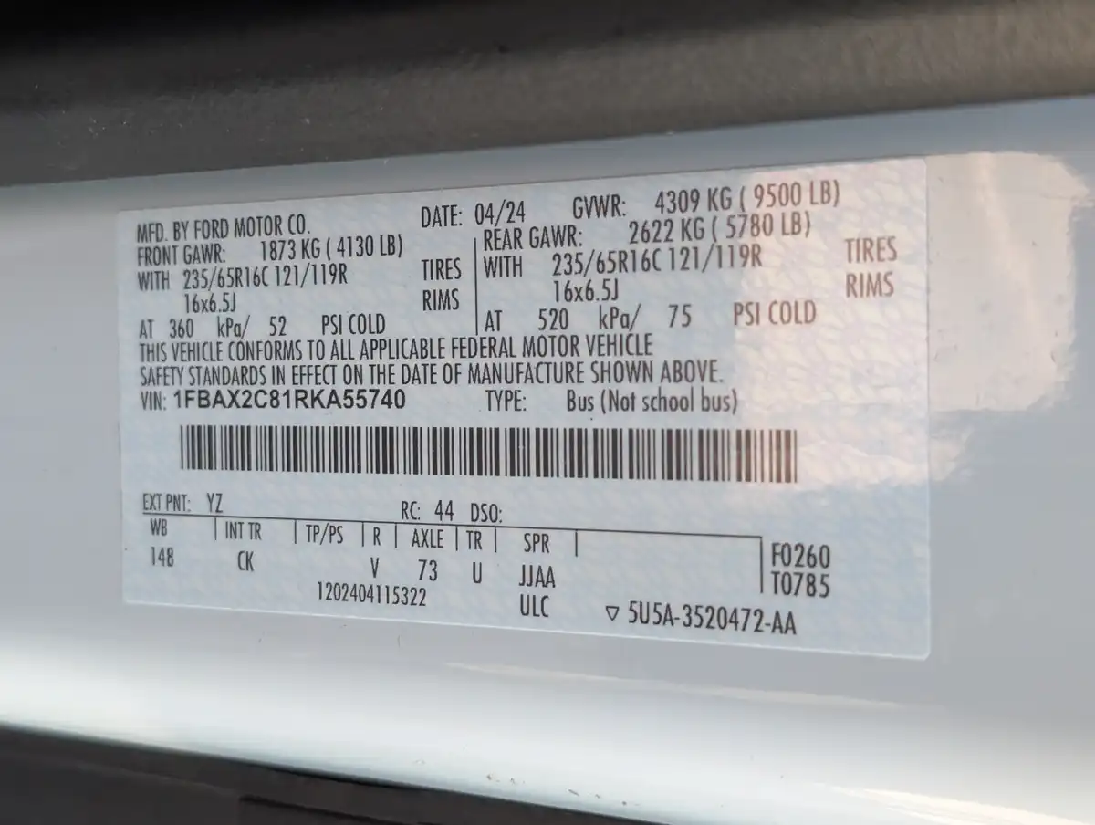 The 2024 Ford Transit-350 Long Mid Roof Passenger Van XLT is a versatile and spacious vehicle designed to meet the demands of both business and personal use. Featuring a long wheelbase of 148 inches and a robust GVWR of 9,500 pounds, this van offers ample room and strength for transporting passengers or cargo. Equipped with a backup camera for enhanced safety and measuring 235.5 inches in length, 97.4 inches in width, and 99.2 inches in height, it combines practicality with modern convenience.
